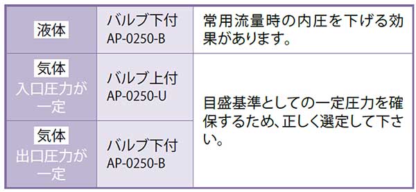 水、空気以外の流体にも使用できます。そのときの換算については、AP-0200カタログを参照ください。